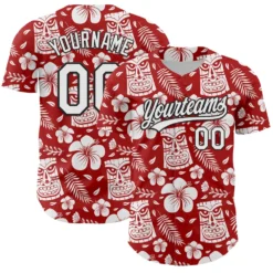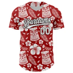 Custom Red White-Black 3D Tropical Hawaii Jungle Leaves Flower And Tiki Mask Authentic Baseball Jersey