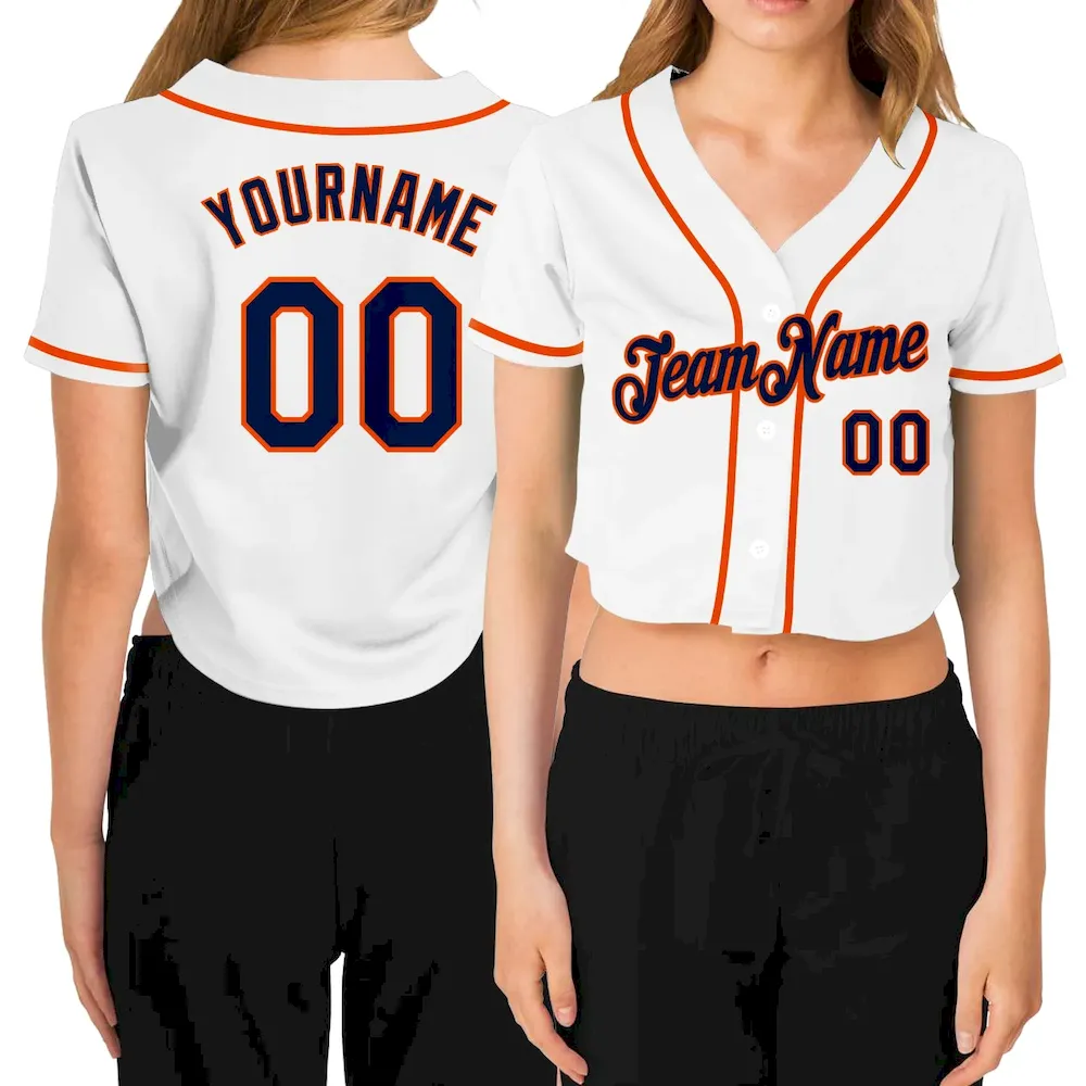 Custom Women’s White Navy-Orange V-Neck Cropped Baseball Jersey